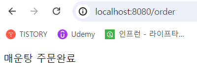 위 PrgPattern 클래스는 컨트롤러이며 GET으로 /order를 호출 시 text를 제출하는 페이지이며 text를 POST 방식으로 /order를 호출시 text 정보와 주문완료를 문자열로 리턴해준다.
