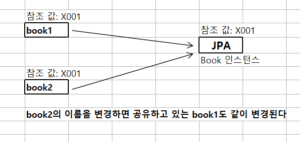 위의 Main의 코드에서 book2의 이름만 변경 했는데 book1의 이름도 같이 변경된 것을 확인할 수 있다. 이는 book1의 참조 변수와 book2 참조형 변수의 참조 값이 공유했기 때문에 발생한 것이다.(아래 이미지 참조.) 참고로 이를 사이드 이펙트 발생이라고 보며 사이드 이펙트는 어떤 하나의 계산으로 인해 추가적인 부수 효과를 발생한 것을 의미한다.