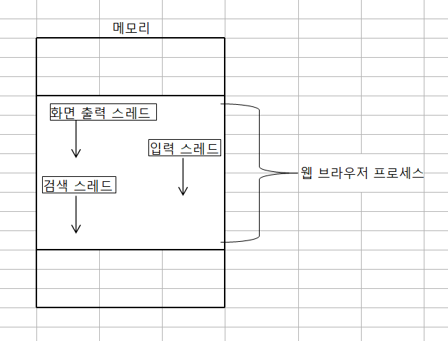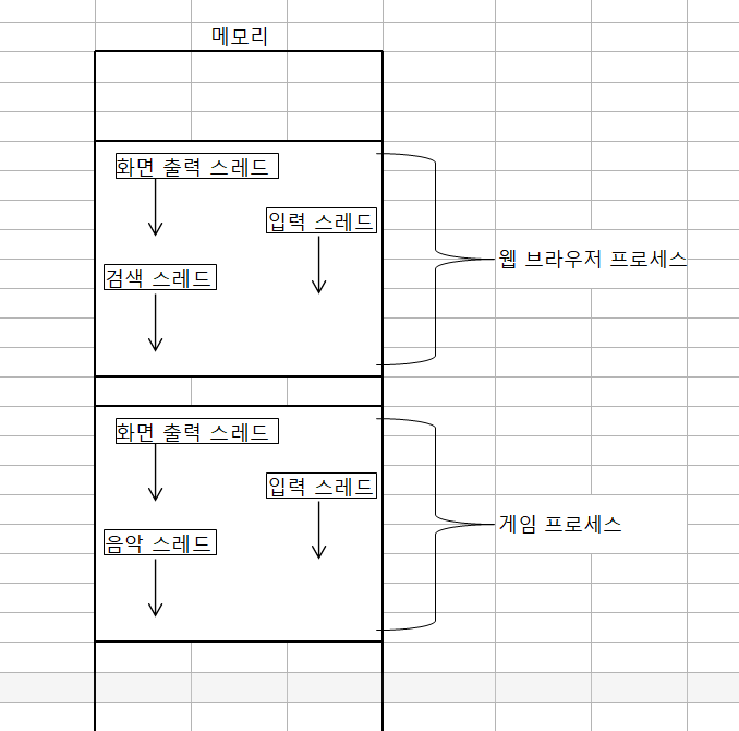 만약 Hello를 출력하는 프로그램이 있다고 가정하고 출력을 2개 이상 하고 싶다면 2개 이상의 프로세스를 실행하면 되고(멀티프로세스는), 하나의 프로세스에서 여러 개의 스레드를 실행(멀티스레드)하면 된다. 이 두개의 큰 차이는 뭘까? 답은 자원 공유이다. 멀티프로세스는 2개 이상을 실행하면 코드 영역, 데이터 영역, 힙 영역 등의 자원이 복제되어 메모리에 적재되는데, 멀티스레드는 하나의 프로세스가 가지고 있는 자원을 공유한다. 즉 메모리를 효율적으로 사용할 수 있다.