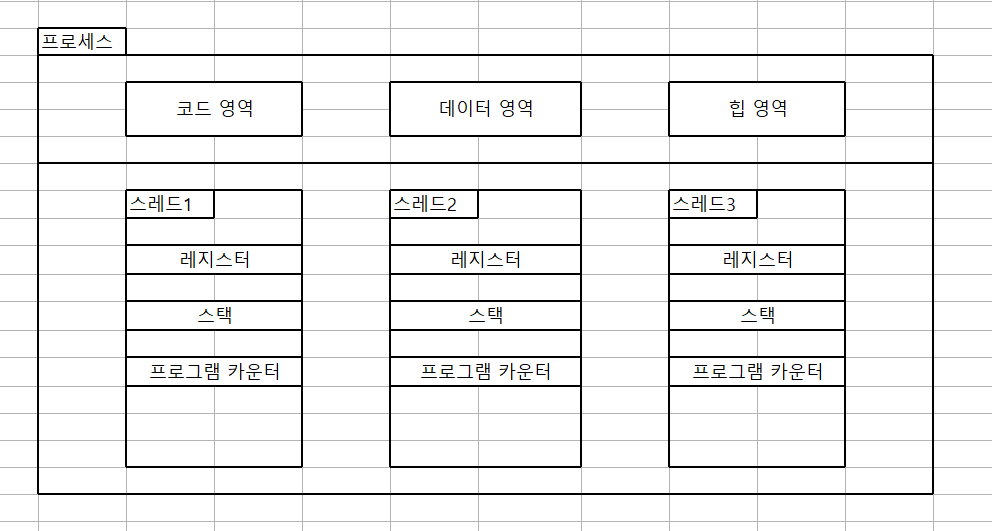 스레드는 실행의 단위이며, 프로세스를 구성하는 실행의 흐름 단위이다. 하나의 프로세스에는 여러 개의 스레드를 가질 수 있으며, 프로세스 내의 여러 개의 스레드가 동시에 실행될 수 있다.